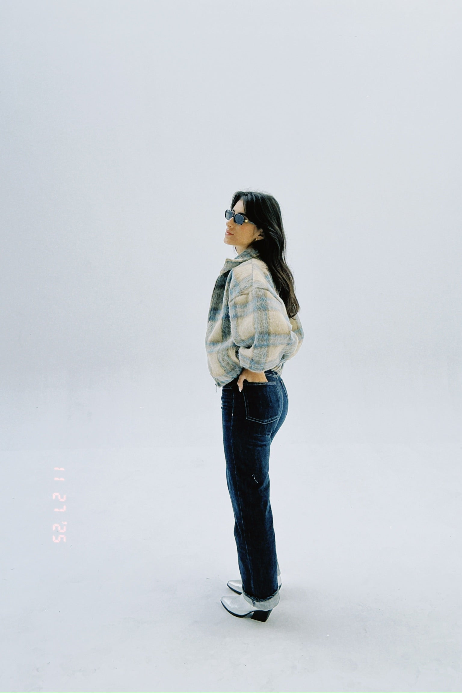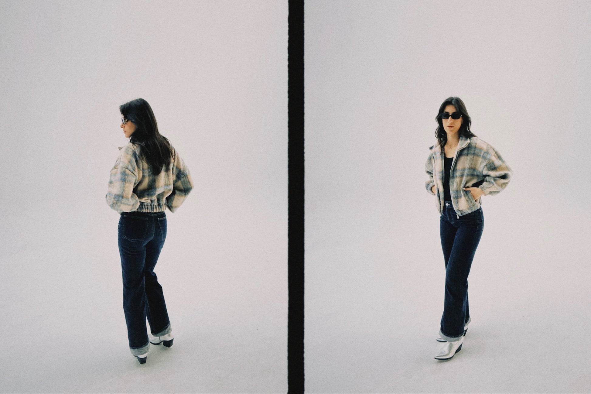 A cozy twist on a classic — The Bomber Jacket features a soft, plush texture with a muted beige and blue plaid pattern that adds effortless warmth and style. Its relaxed fit and zip-front design make it the perfect statement layer for cooler days.