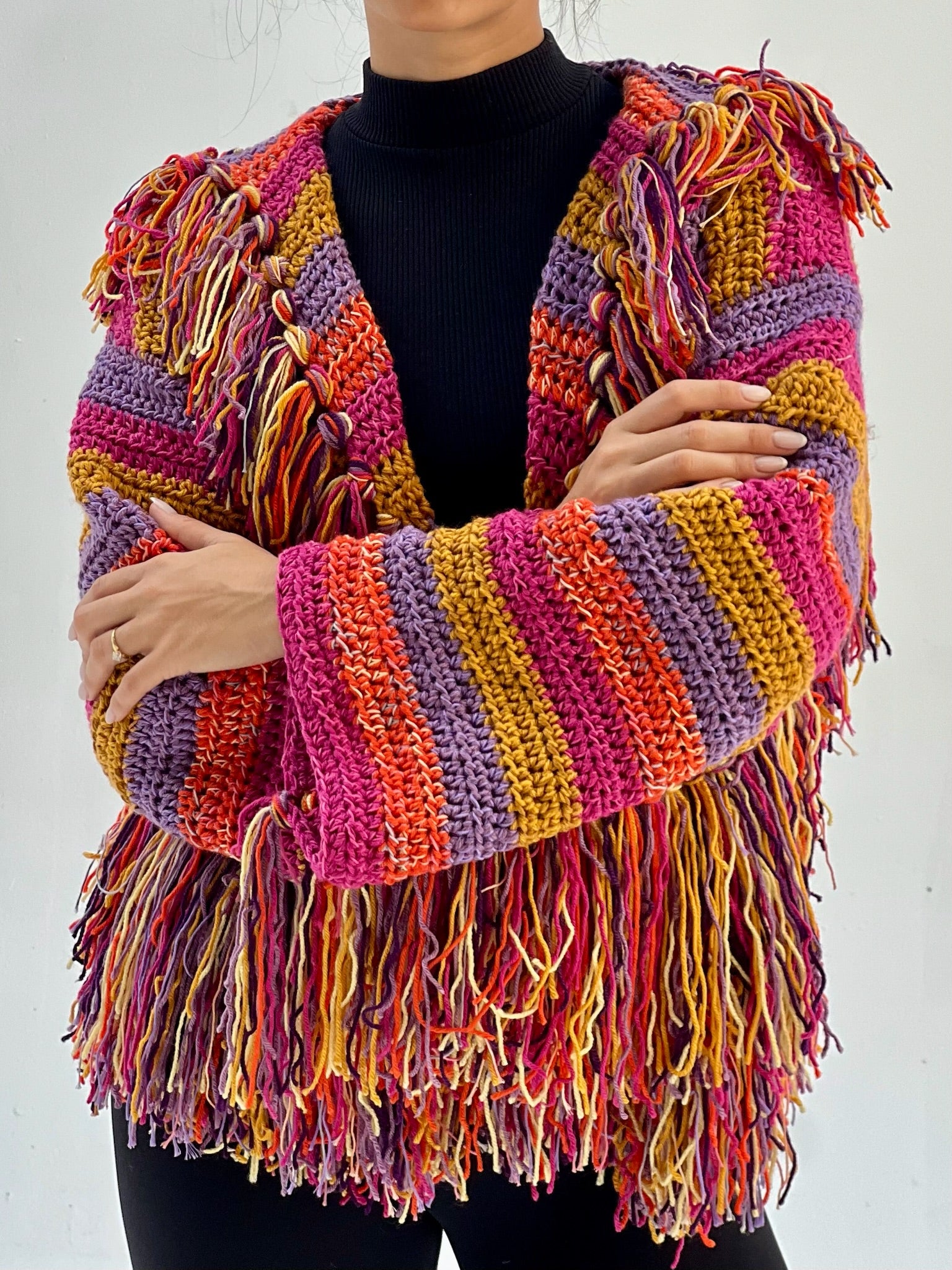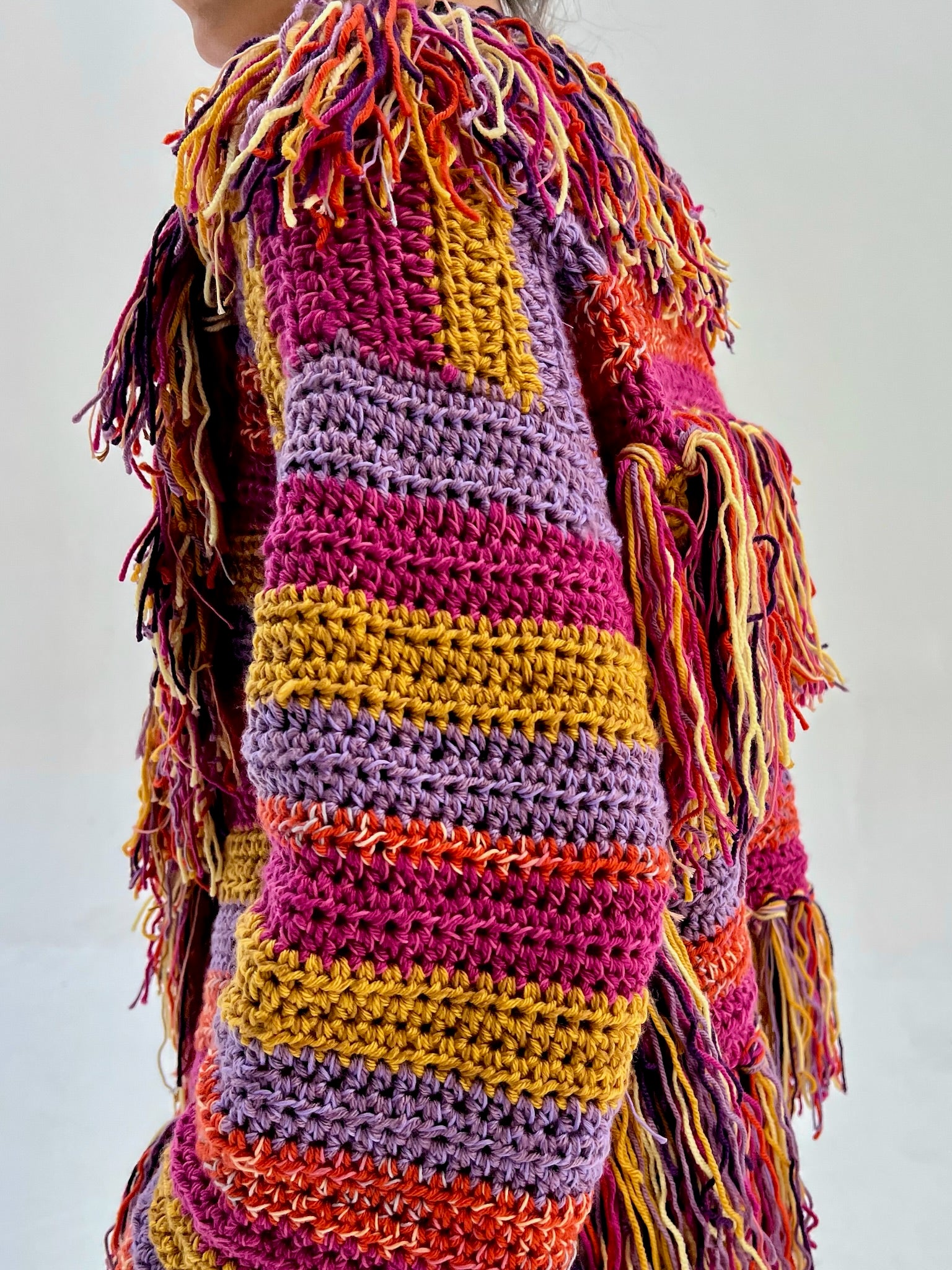 A true labor of love — each Lolita Cardigan is delicately hand-crocheted by talented Egyptian women over more than 100 hours of craftsmanship. With its vibrant mix of colors and intricate detailing, no two pieces are ever exactly the same, making each cardigan beautifully unique.